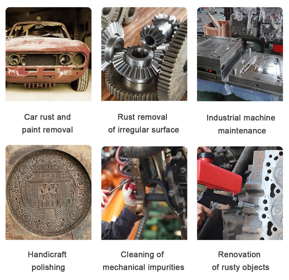 ▶ یہ سینڈ بلاسٹ بندوقیں بڑے پیمانے پر سطح کی صفائی یا ہارڈ ویئر، لوہے، دھات، سٹیل، سانچوں وغیرہ کی تزئین و آرائش کے لیے استعمال ہوتی ہیں، براؤن کورنڈم اور سفید کورنڈم استعمال کرتی ہیں۔